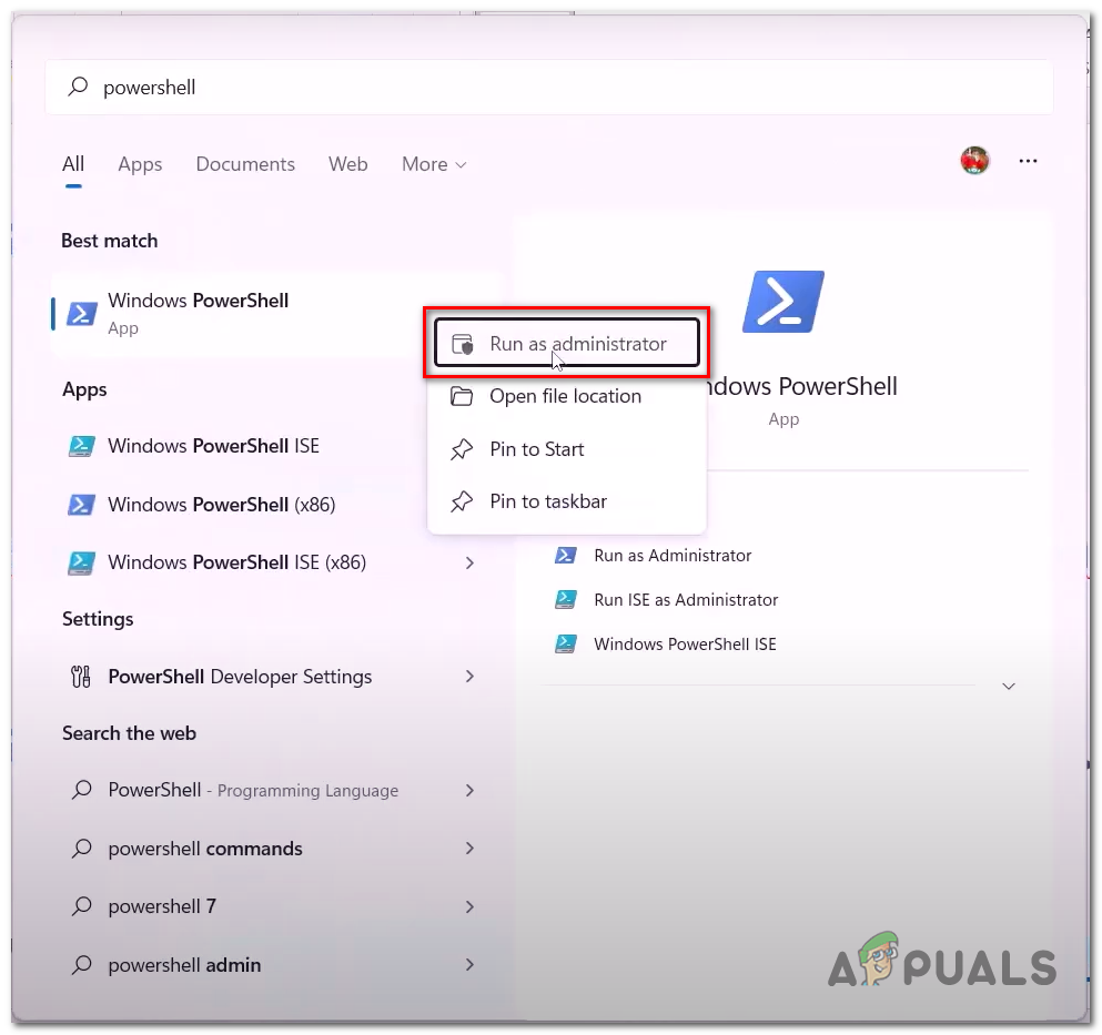 - In the search bar type Powershell and run it as administrator.