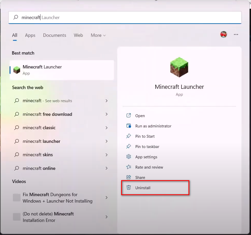 - Search Minecraft Launcher and click on Uninstall.
