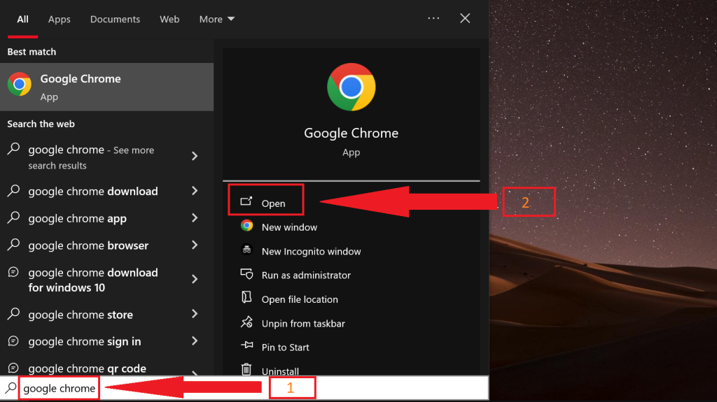 - Type your preferred web browser’s name (e.g., Google Chrome) in the Windows search box.