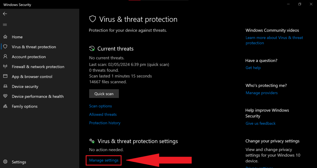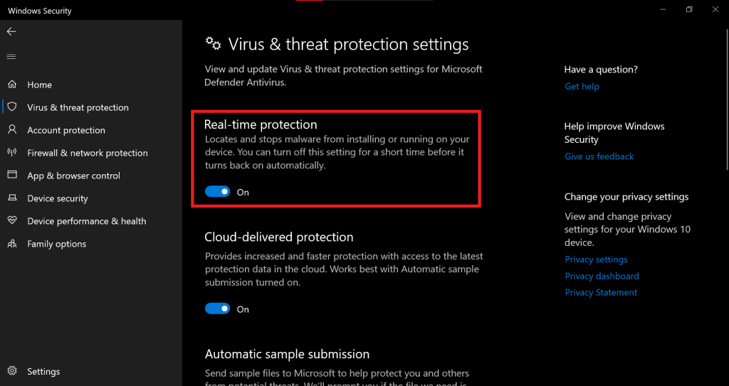 Note: Re-enable your Windows Defender settings after testing the game for the error.