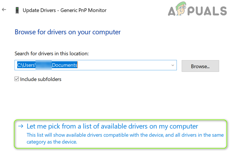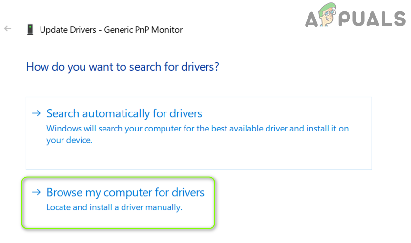 Select Browse My Computer for Drivers - Now, near the bottom of the window, open ‘Let Me Pick from a List of Available Drivers on My Computer’ and select Generic PnP Monitor.