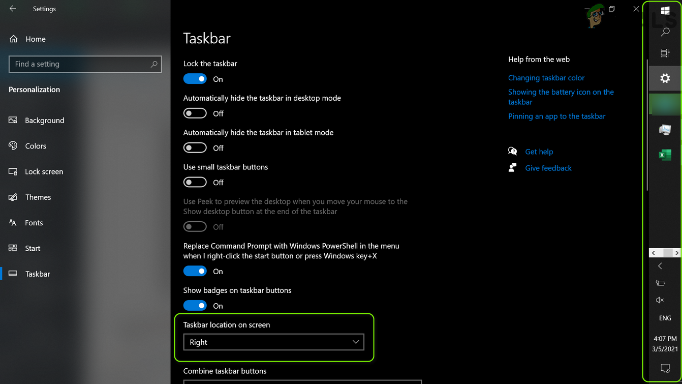 Open the Taskbar Settings - Now, expand the dropdown of the ‘Taskbar Location on Screen‘ and select a different option that is currently selected (e.g., Right).