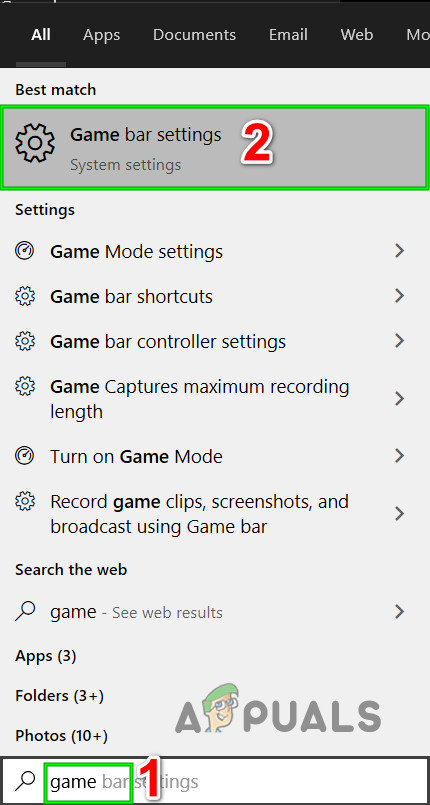 - Press Windows key, type Game Bar and in the resulting list, click on the Game Bar Settings.