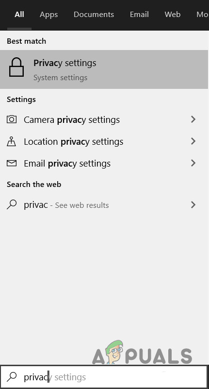 - Press Windows key, type Privacy and from the resulting list, click on Privacy Settings.