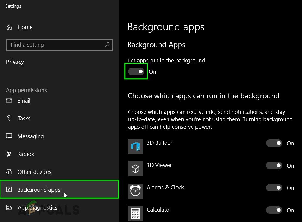 Toggle the Switch of Let apps run in the background to On - Now launch the game and broadcast and see if the issue is resolved. Also consider restarting your computer before broadcasting again.
