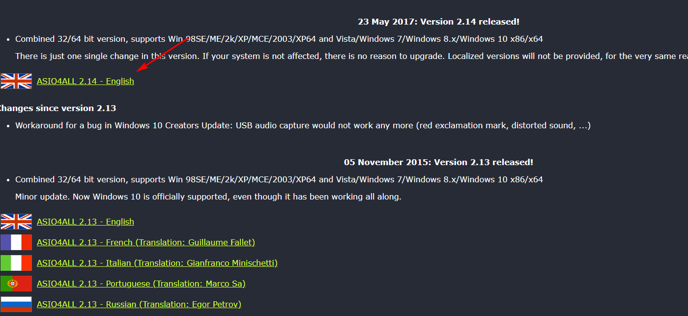 - Visit this link (here) and download the latest version of the Asio4all driver by downloading the latest version associated with your language.