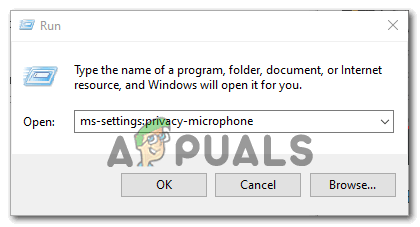 - Open up a Run dialog box and press Windows key + R. Next, type ‘‘ms-settings:privacy-microphone” and press Enter to open up the Microphone Privacy window for the Windows Settings app.