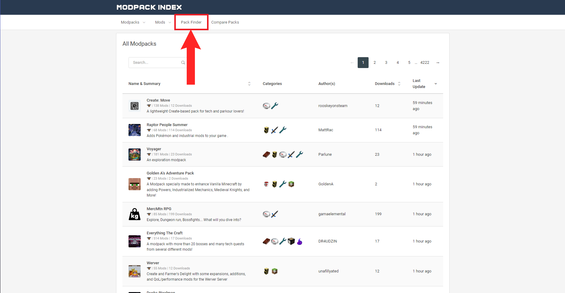 - Open up Modpack Index. Choose the Pack Finder option from the top menu.