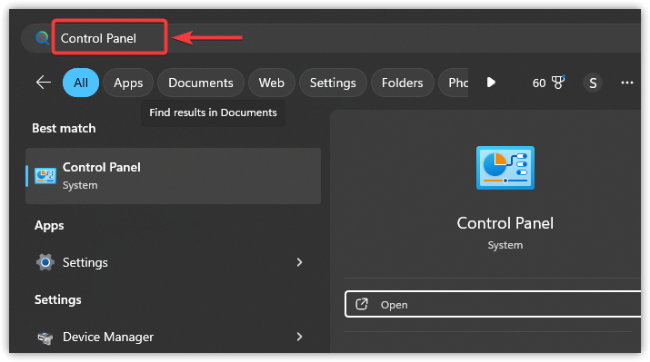 - Click the Search icon (magnifying glass) in your taskbar, type “Control Panel“, and press Enter.