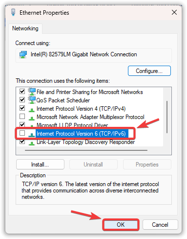 - Uncheck the box for “Internet Protocol Version 6 (TCP/IPv6)“.