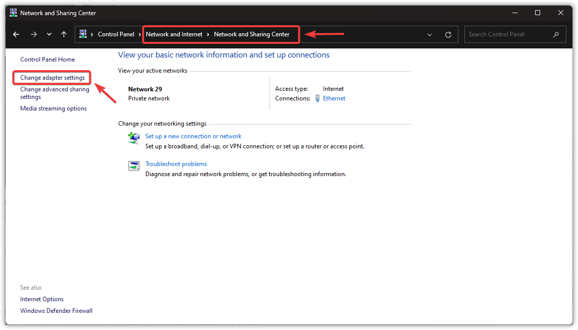- In the Control Panel, select Network and Internet > Network and Sharing Center.