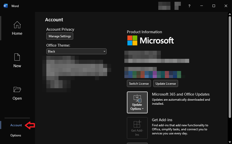 - Open any Office application (e.g., Excel or Word) and go to the Account menu.