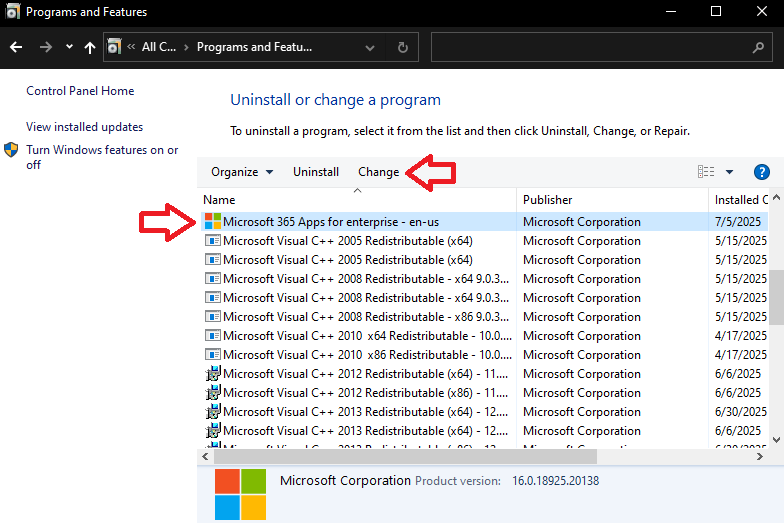 - Locate Microsoft 365/Office in the list of programs. Click it and select ‘Change’.