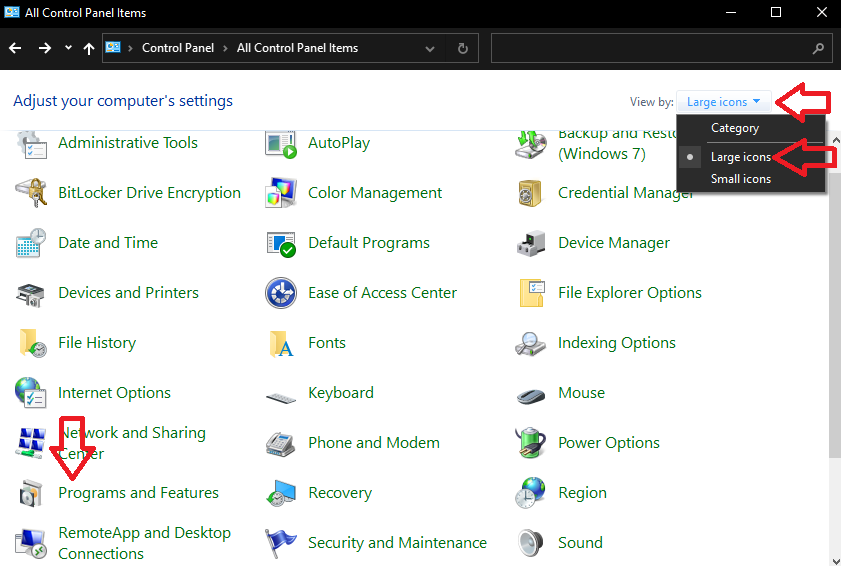 - Click on the ‘View by’ drop-down menu and select Large icons. Then click on Programs and Features.