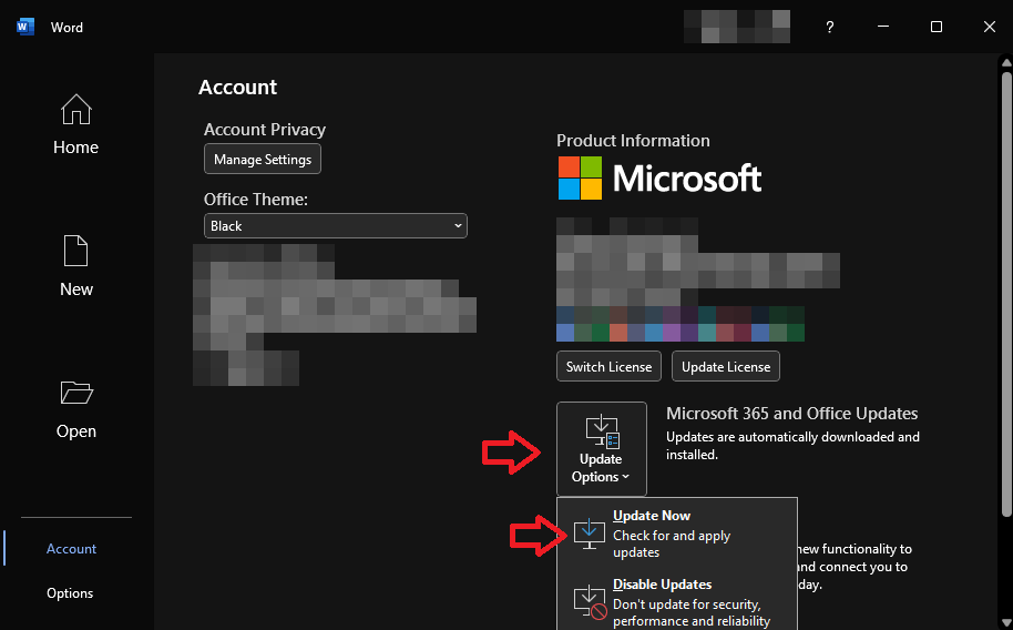 - Click Update Options and select ‘Update Now’ to manually update Office.