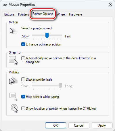 - In the Mouse Properties window, navigate to the Pointer Options tab.