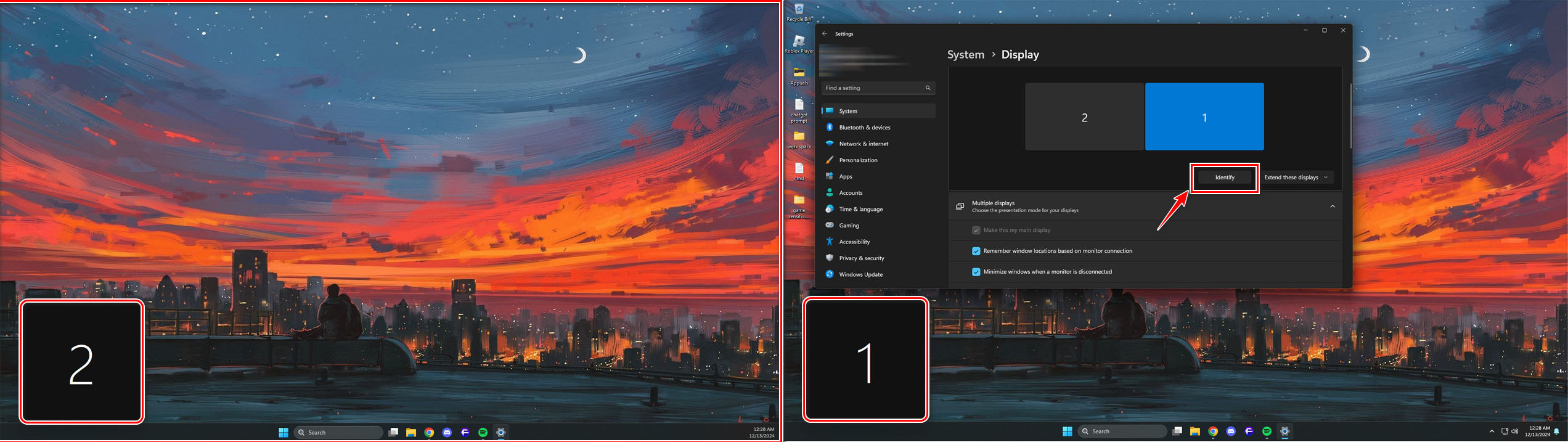 - In the Display Settings window, click on Identify. This will display numbers on each monitor, helping you recognize which monitor is which.
