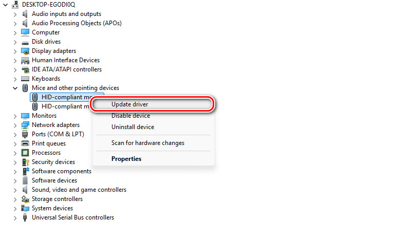 - In Device Manager, expand the Mice and other pointing devices section. Right-click on your mouse and select Update driver.