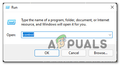 - Press Windows key + R to open up a Run dialog box. Next, type ‘control’ inside the text box and press Enter to open up the Classic Control Panel interface. If you’re prompted by the User Account Control window, click Yes to grant admin access.