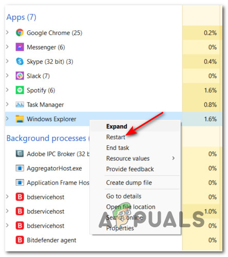 - File Explorer bug – The majority of user documented cases in which this problem occurs are somehow related to File Explorer. If you’re only experiencing this issue while File Explorer is opened in the background but you’re not actively using it, one way to resolve the issue temporarily is to use Task Manager to restart the main process behind File Explorer.