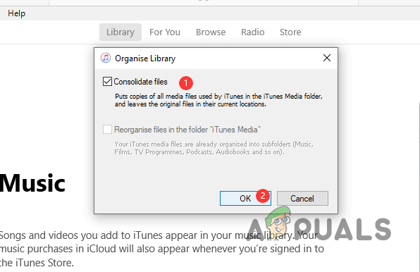 Navigating to Organize Library - This will bring up a new dialog box. In the dialog box, tick the Consolidate files checkbox and click OK.