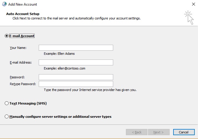 - Now enter your real name followed by your email address and password. Since most ISPs currently support auto account setup, I’m going to assume yours does too. Hit Next and wait for the auto setup is complete.