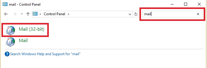 - Access the Control Panel use the search bar (top-right corner) to find the Mail settings. Double click on the 32-bit version.