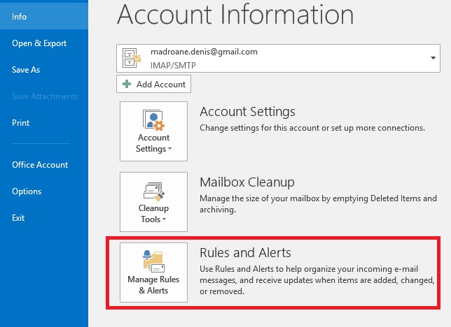 - Now open Outlook and navigate to File > Rules and Alerts.