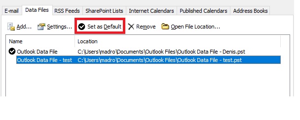 - Now click on the imported PST file to select it and hit the Set as Default button.