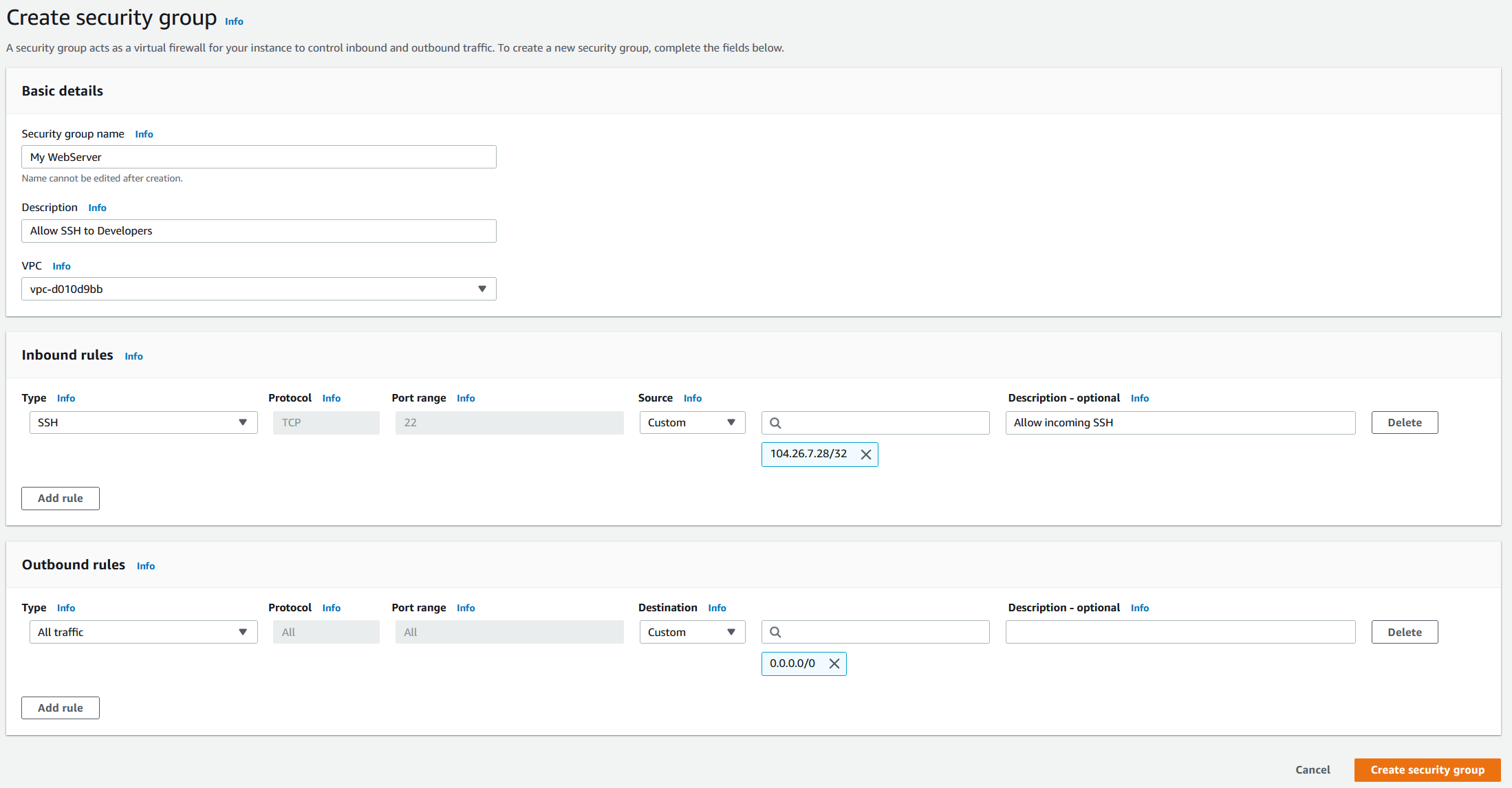 - Security group name – Name for the security group. The name can’t be edited after the security group is created. In our case, it is My Webserver.