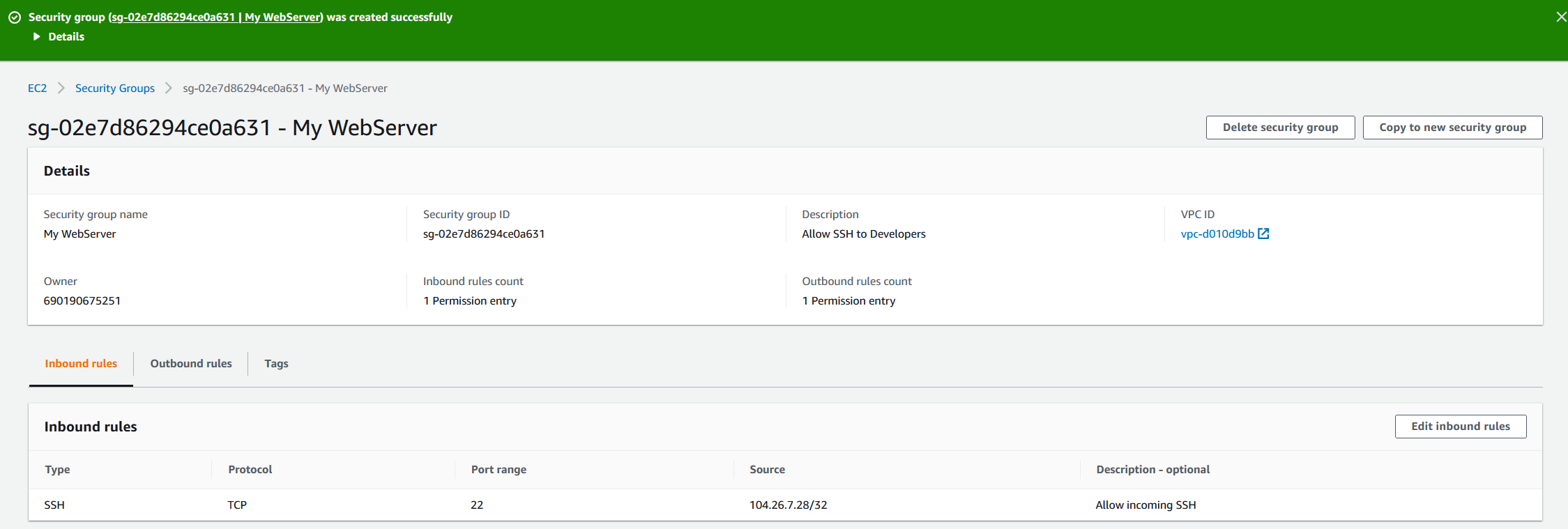- Description – A description to help you identify the security group. In our case, it is Allow SSH to Developers.