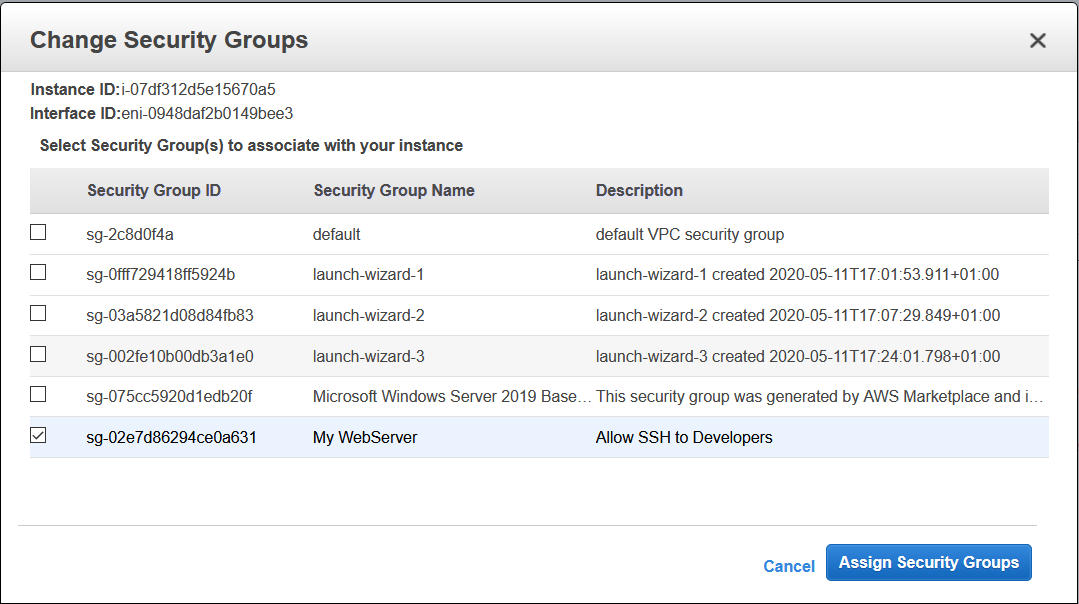 - Select the security group from the list and click Assign Security Groups. In our case, we will move EC2 instance to the newly created security group My WebServer.