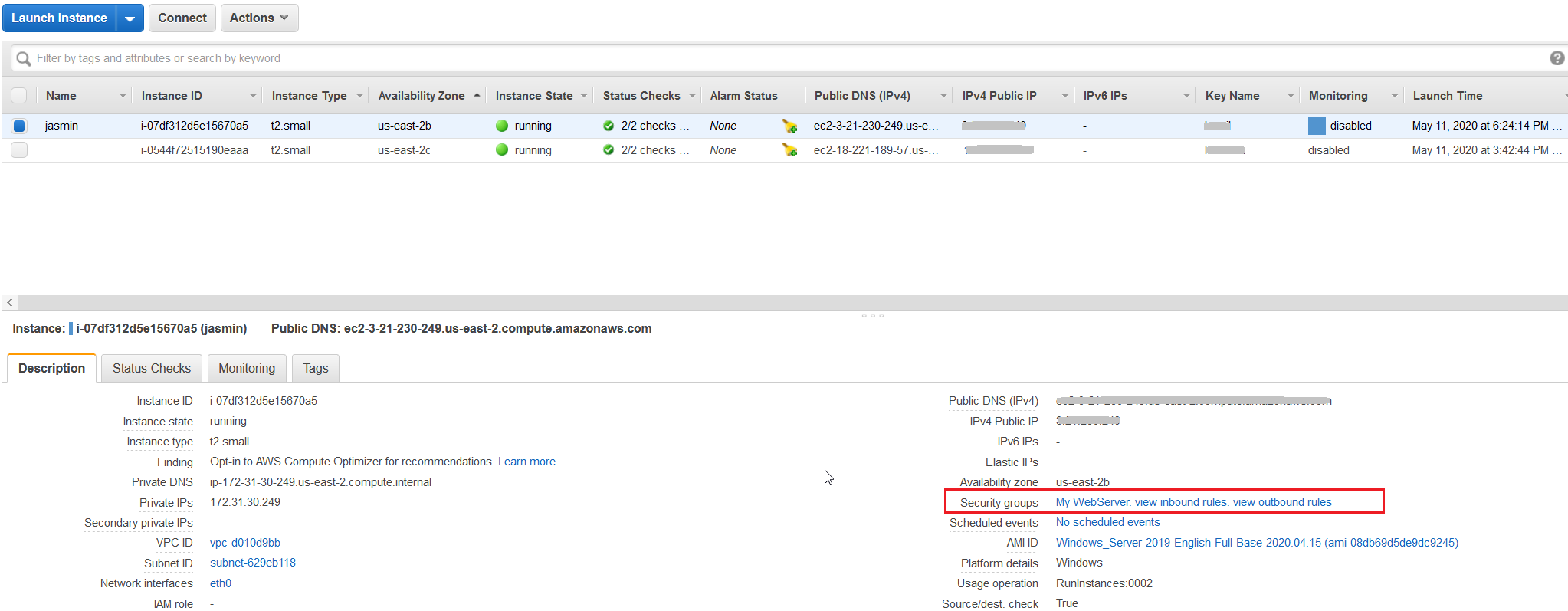 - Select the instance and then click on the Description On the right side of the window, you can see that EC2 is using the newly created security group My WebServer.