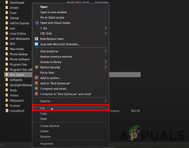 - Right-click on the Riot Games, and click on Cut to copy the files.