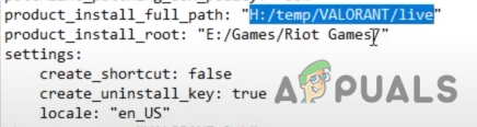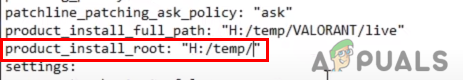 - Replace the value of the product_install_root path with the parent folder of the Valorant files. For example, c:/temp/Valorant/live so in this path temp is the parent folder.