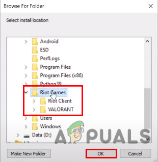 Select the location where you moved Valorant - Once you selected the new location, press ok and it will start the verification process.