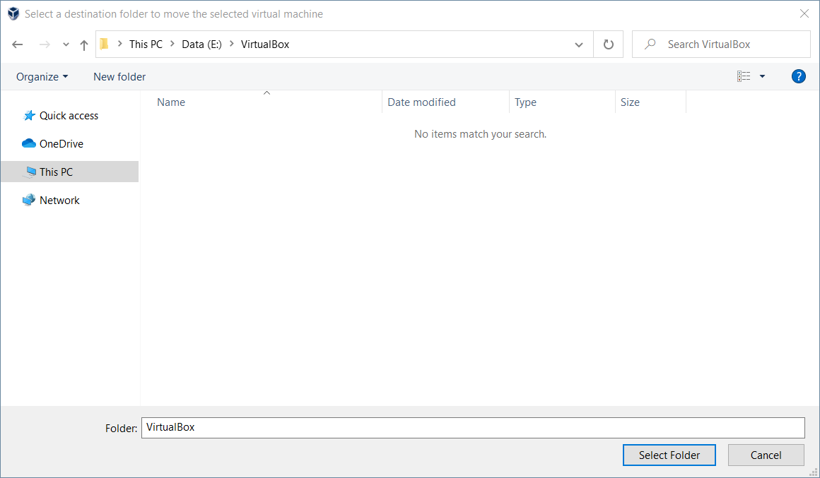 - Select a destination folder to move the selected virtual machine and then click Select Folder. We will move the virtual machine Windows 10 to secondary disk (E:\VirtualBox).