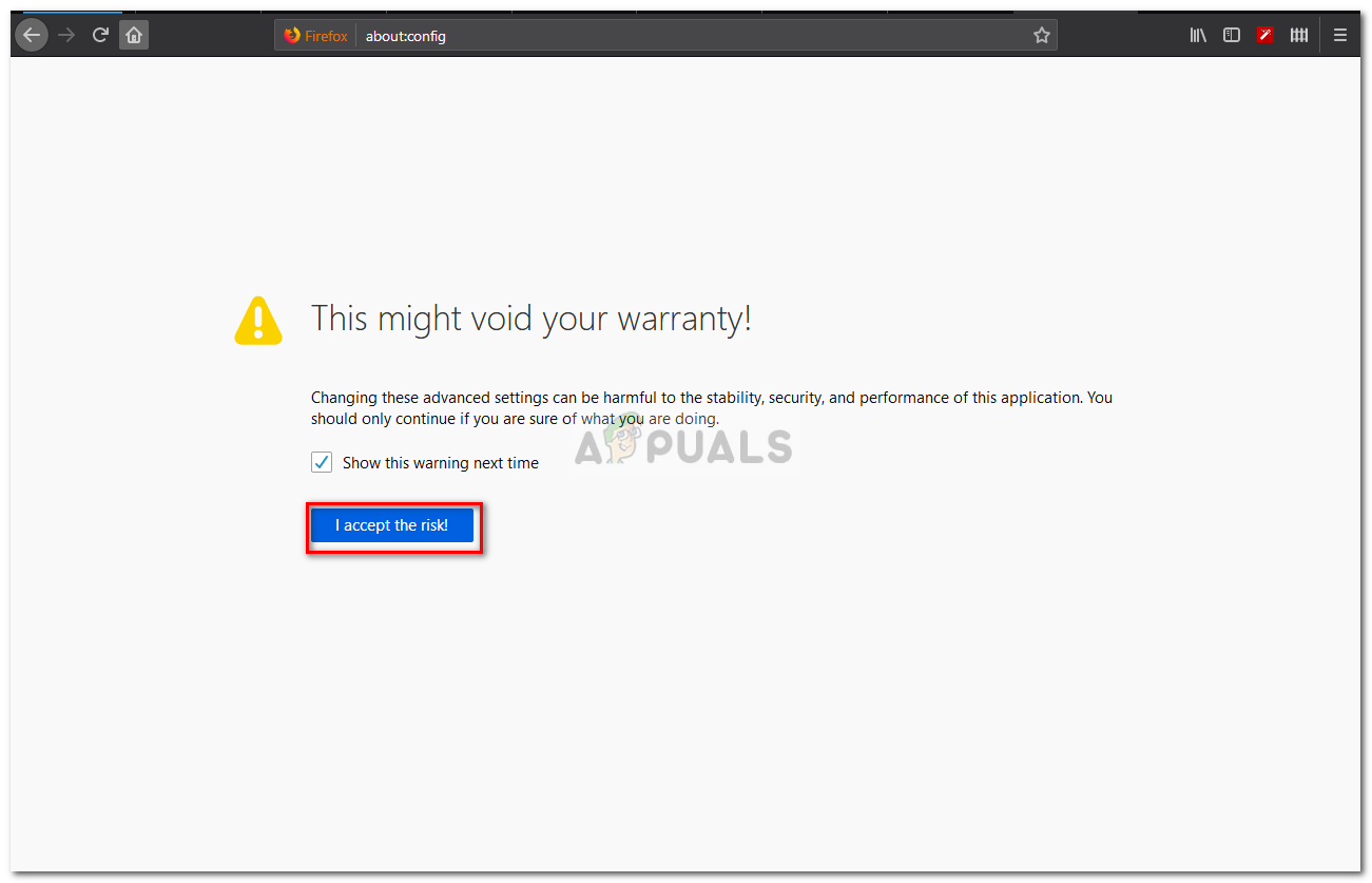 - Open Mozilla Firefox, paste ‘about:config‘ inside the navigation bar and press Enter to open up the Advanced Settings menu of this browser.