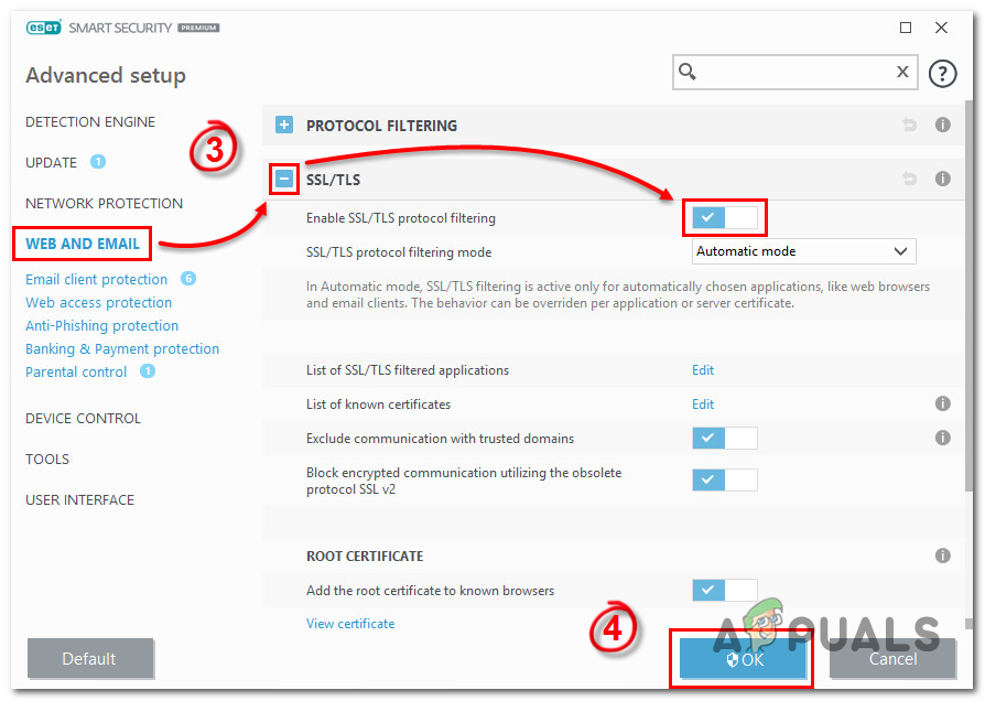 For example, in ESET Smart Security, you can do this by going to Web and Email > SSL / TLS and disabling the toggle associated with Enable SSL / TLS protocol filtering. After you do this, click Ok to save the changes, then click Yes at the UAC (User Account Control) to grant administrative privileges.