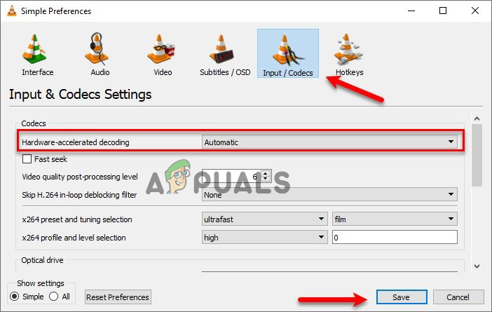 - Then click on the Inputs/Codecs tab and set the Hardware-accelerated decoding to Automatic.