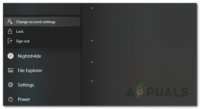 - You can either hover your mouse of the small profile listed on the left-hand side of the Start Menu. Right-click the icon and then select Change Account Settings from the menu that appears.