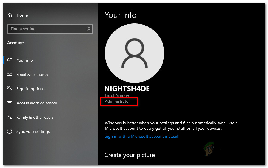- If you do it via the user account icon on the left, you will be taken to the Your Info tab. Here, if your account is an administrator account, you will be able to see Administrator written under your account name.