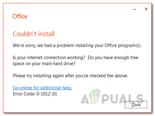 As it turns out, the error message indicates that the issue can be caused by two reasons. First of all, if you are not connected to the internet and you are using the online installer of MS Office, you might face the error. Secondly, if you do not have enough space on your hard disk for MS Office, the said error might be triggered. While these are true and the causes can be held accountable, fixing these two problems doesn’t really get rid of the error message in some scenarios.