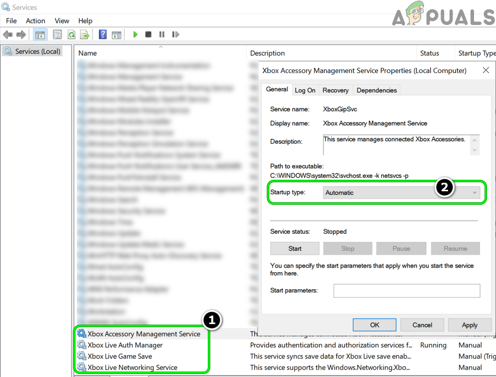 Set the Startup Type of Xbox Services to Automatic - Then click on the Start button (if the service is stopped) and repeat the same for the following services: