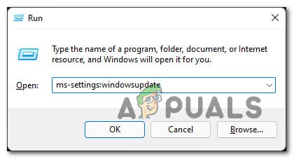 - Then, in the text box, type ‘ms-settings:windowsupdate’ and click Enter to access the Windows Update tab of the Settings app.