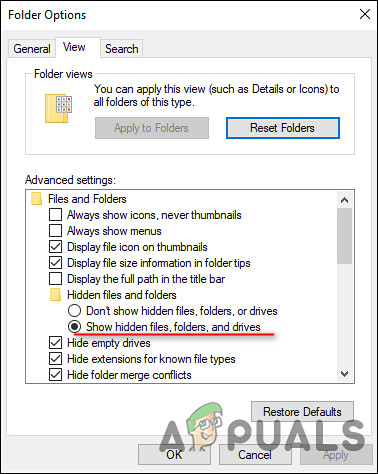 - In the Folder Options window, head over to the View tab and under Advanced settings, click on ‘Show hidden files, folders, and drives’.