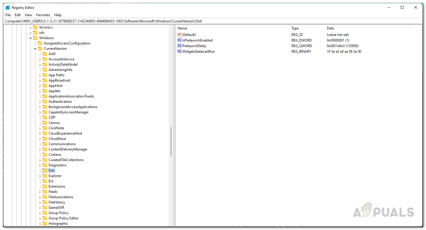 Navigating to Dsh Folder - Once you have found the Dsh folder, on the right-hand side, double-click on the IsPrelaunchEnabled key.