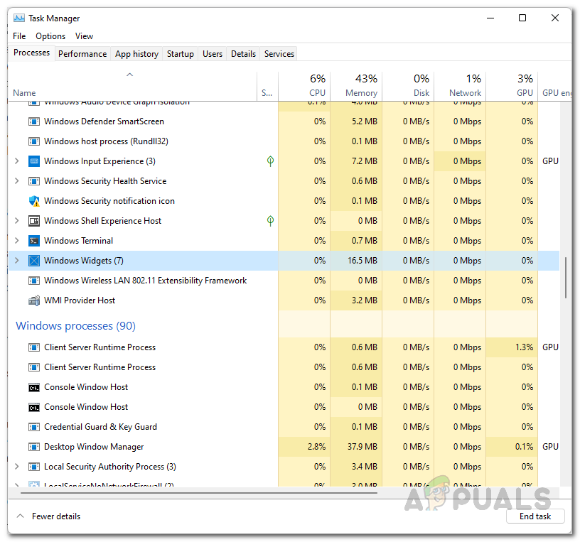 Ending Windows Widgets Process - Do this for both the applications. Once you have done that, you will notice that the msedgewebview2.exe processes will disappear from the Details tab of the Task Manager.