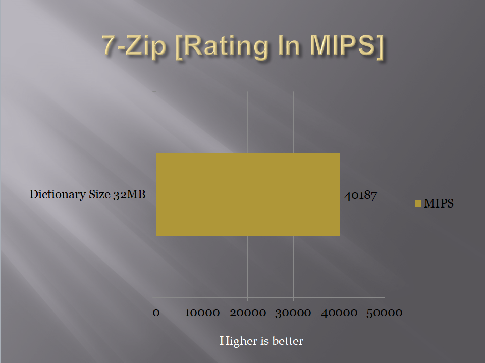 7-Zip is a compression benchmark which utilizes the Memory bandwidth and CPU Cores to measure the performance which is relative. Our graph is showing the overall MIPS.