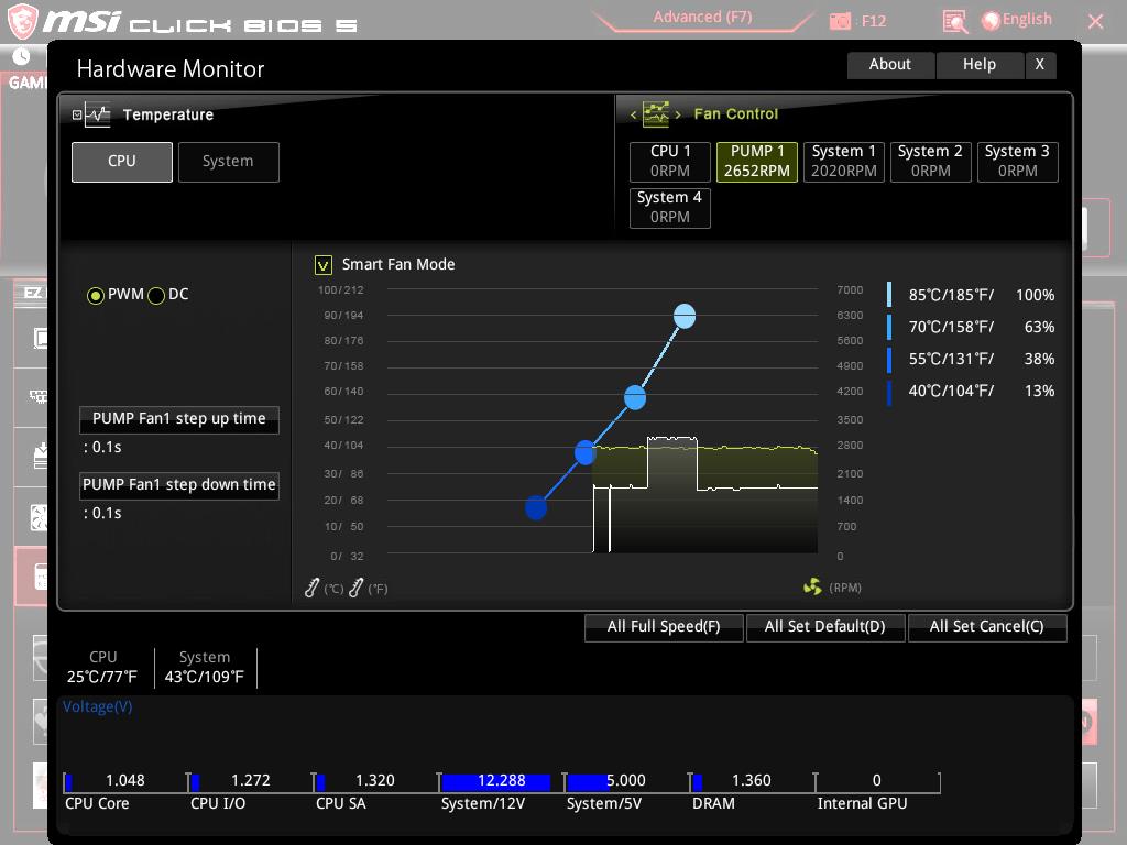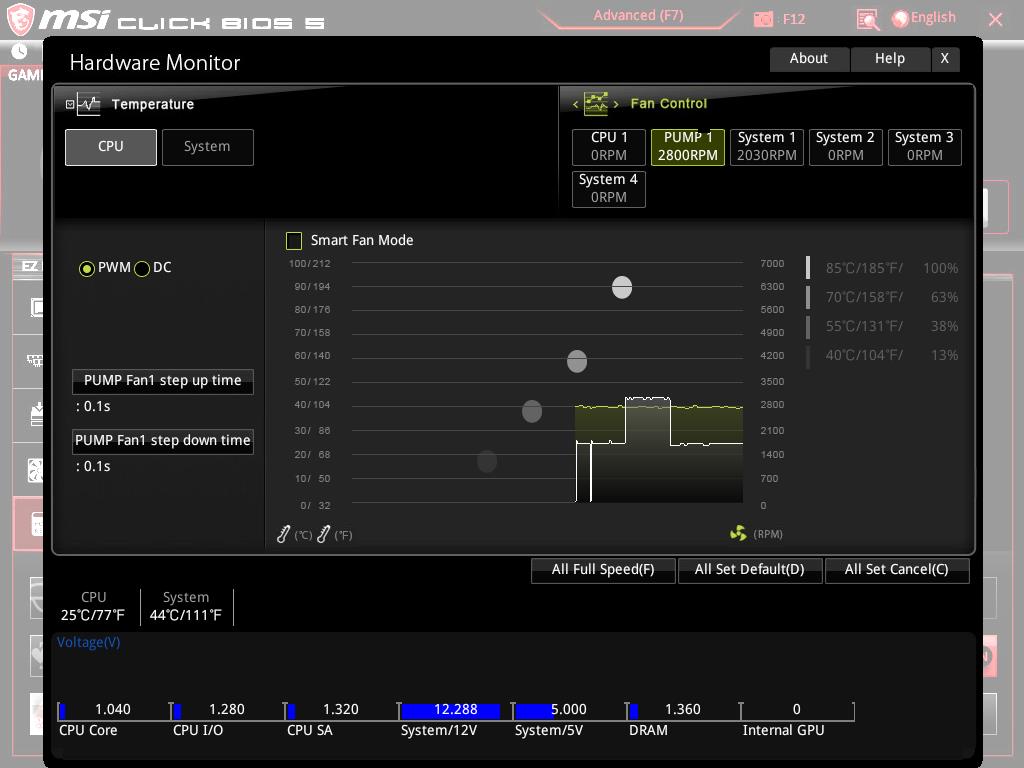 Clicking on the Hardware Monitor will load another interface with tons of the options to customize the fans speed connected to the fan headers. CPU fan header is shown separately whereas the System fan headers are shown as System 1, System 2, System 3, System 4. Each header can be set to PWM/DC mode depending upon the type of the fan connected to the corresponding header. The user can set the Step Up and Step Down speed settings of each fan header. The user can make all the fans to run at full speed which can be done with one click. Similarly, they can be set to run at default or cancel the loaded settings. The smart fan mode will allow the users to customize the fan curve profile for each fan subject to the requirement. For a user like me who loves to control the fan(s) from the BIOS, the MSI has done a good job. At the bottom of the interface, voltage readings are shown. The temperatures are shown in °C/°F.